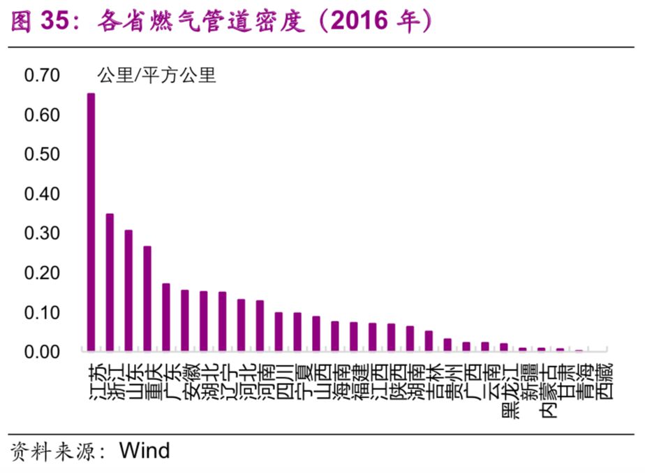 能源基礎(chǔ)設(shè)施方面,東部地區(qū)普遍高于中西部地區(qū)。2016年,燃氣管道密度排名前三的是江蘇(0.65公里/平方公里)、浙江(0.35公里/平方公里)、山東(0.31公里/平方公里)(圖35);人均燃氣管道[22]排名前三的也是浙江(8.4公里/萬人)、寧夏(7.5公里/萬人)、重慶(7.2公里/萬人)(圖36)。